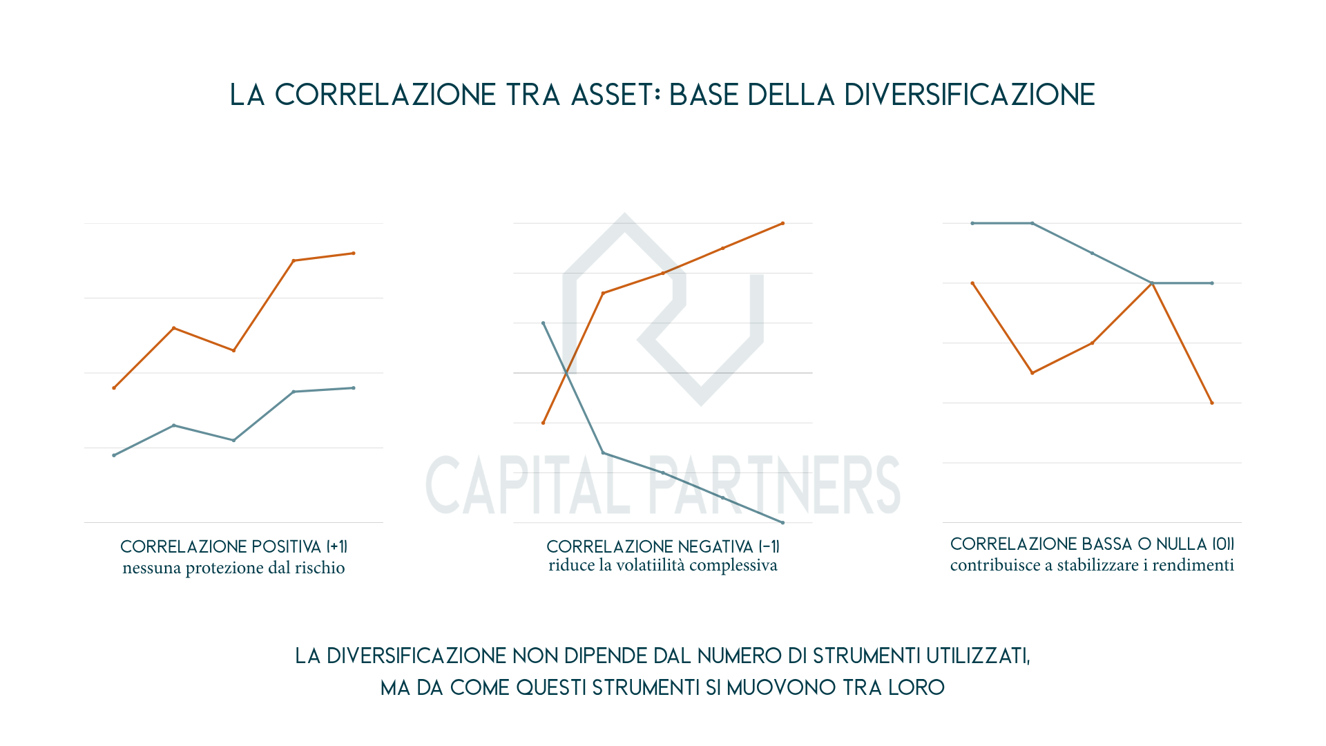 Quando parliamo di diversificazione, non intendiamo semplicemente “avere strumenti diversi”, ma combinare asset che non si muovono tutti nella stessa direzione.
