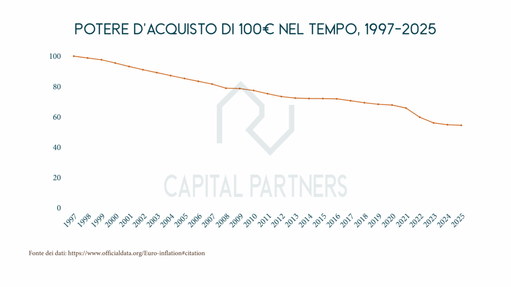 Se le cose stanno così, non è difficile immaginare il risultato di un 2% annuale composto (anche l’inflazione, come ogni interesse, si compone) sul potere d’acquisto del nostro denaro nel tempo.