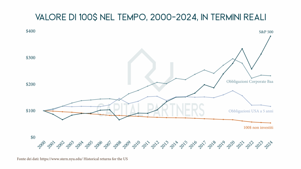 Se l’inflazione è una proprietà non contingente del nostro sistema economico, è fondamentale investire la liquidità in eccesso di cui si dispone. Il denaro è uno strumento e, come tale, va pensato in termini reali e non nominali. Quanti soldi mi serviranno fra x anni per poter acquistare gli stessi beni e servizi che acquisto oggi?